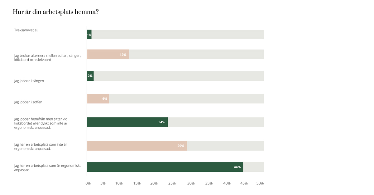 Att få till en för kroppen skonsam arbetsställning är inte helt lätt hemmavid. Hela 18 procent har fått fysiska besvär av att jobba hemifrån under pandemin. Det är dessutom en siffra som är högre bland yngre, nästan en fjärdedel (24 procent) av de som är mellan 16 och 24 år medan motsvarande siffra bland de som är 35 till 55 år är 16 procent. Det är därför av största vikt att man planerar sitt hemmakontor på ett smart sätt framöver.
