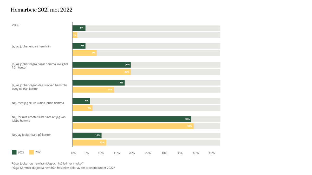 Undersökningen visar att svenskarna tänker jobba lika mycket hemma under 2022 som 2021. 43 procent jobbade hemifrån under 2021 och under 2022 väntas 42 procent arbeta hemma. I storstäderna är det dessutom ännu vanligare med hemarbete. Här har varannan (54 procent) i någon mån jobbat hemifrån och i Stockholm har hela 60 procent gjort det.