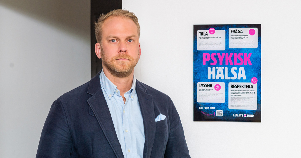 På HRnytts redaktion har vi satt upp den psykiska första hjälpen-tavlan. Här finns stödet för en medmänsklig närvaro; tala, fråga, lyssna och respektera, med en QR-kod med länk till professionella vårdkontakter. Skaffa Always Minds psykiska första hjälpen-tavla
