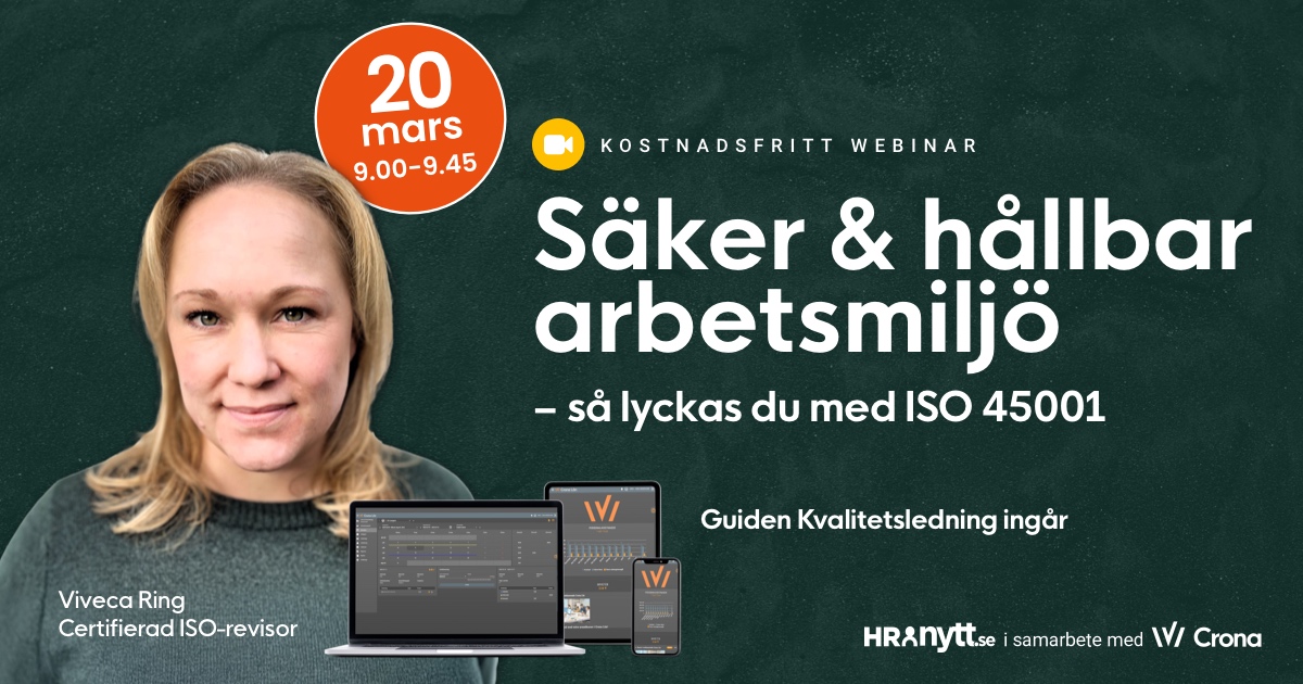 I detta webinar tillsammans med Crona får du höra Viveca Ring, certifierad ISO-revisor, som kommer gå igenom hur ni skapar ett fungerande arbetsmiljöarbete som inte bara gynnar de anställda – utan blir en investering i verksamhetens långsiktiga framgång. Det hjälper er minska risker, skapa en trygg arbetsplats och säkerställa att lagkraven efterföljs.