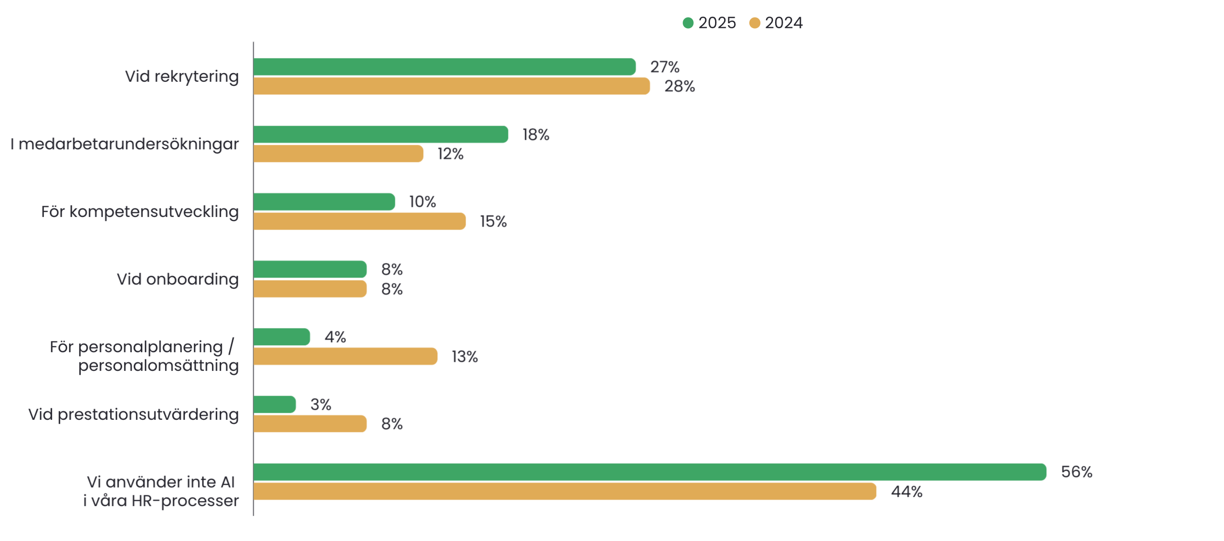 De flesta företag försöker möta den digitala utvecklingen, och allt fler ökar sitt användande av AI i olika processer. Men det gäller inte överallt. Inom HR är det faktiskt en sjunkande trend, enligt resultatet av HR Barometern 2025. I årets undersökning uppgav 56 % av de deltagande företagen att de inte använder någon form av AI i sina HR-processer. 2024 var samma siffra 44%. Med andra ord har HR minskat sina behov av AI med 20%.