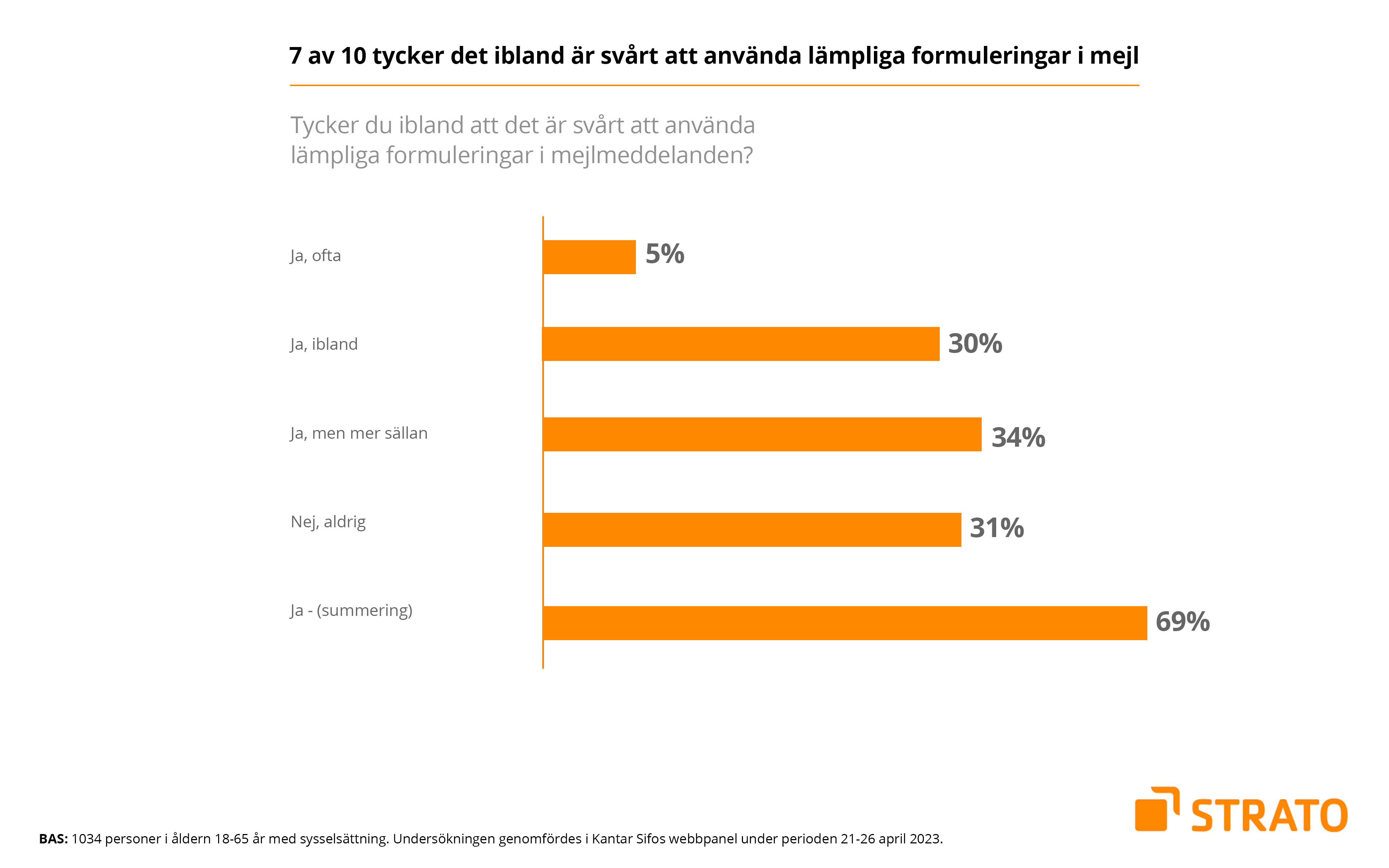 Undersökningen genomfördes på uppdrag av STRATO i Kantar Sifos webbpanel under perioden 21–26 april 2023. Totalt intervjuades 1337 personer i åldern 18–65 år, varav 1034 personer inom sysselsättning. Webbpanelen är riksrepresentativt rekryterad utifrån slumpmässiga urval. Det förekommer ingen självrekrytering i Kantar Sifos webbpanel.
